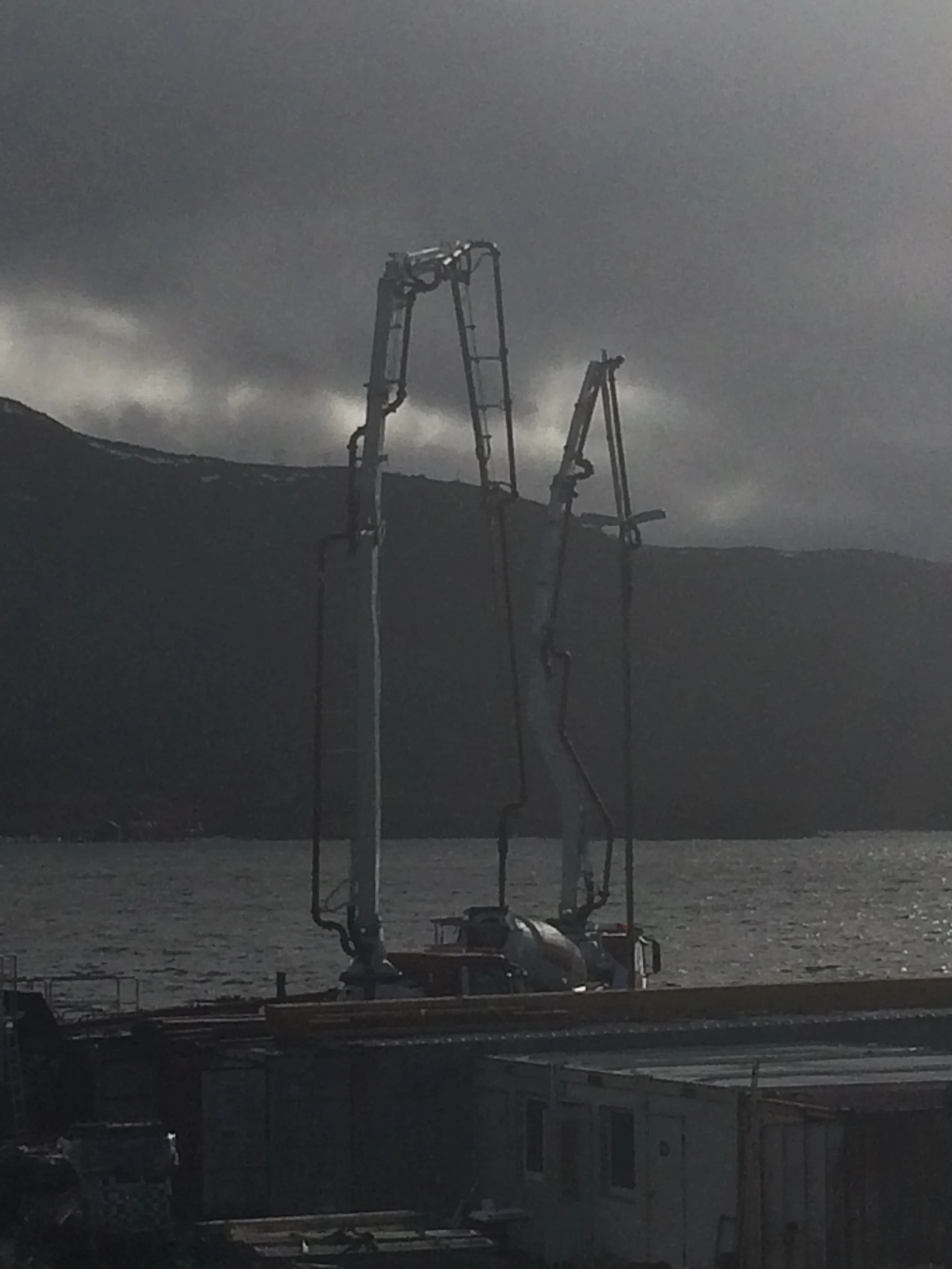 I skumringa vart vi vitne til ein elegant "betongpumpedans" på kaia til Ulstein Betongindustri. Balansert utstøyping på ein flytemolo stiller krav til presisjon...